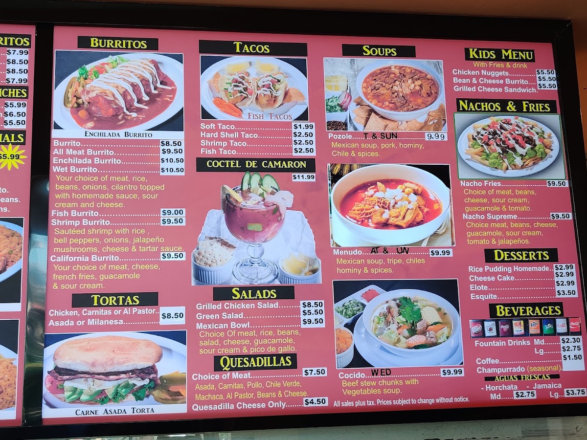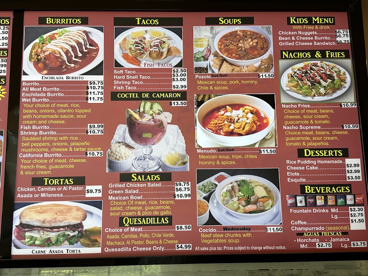- Burritos: Each burrito is crafted with care, from the traditional Burrito to the hearty California Burrito, featuring your choice of meat and delicious fillings.